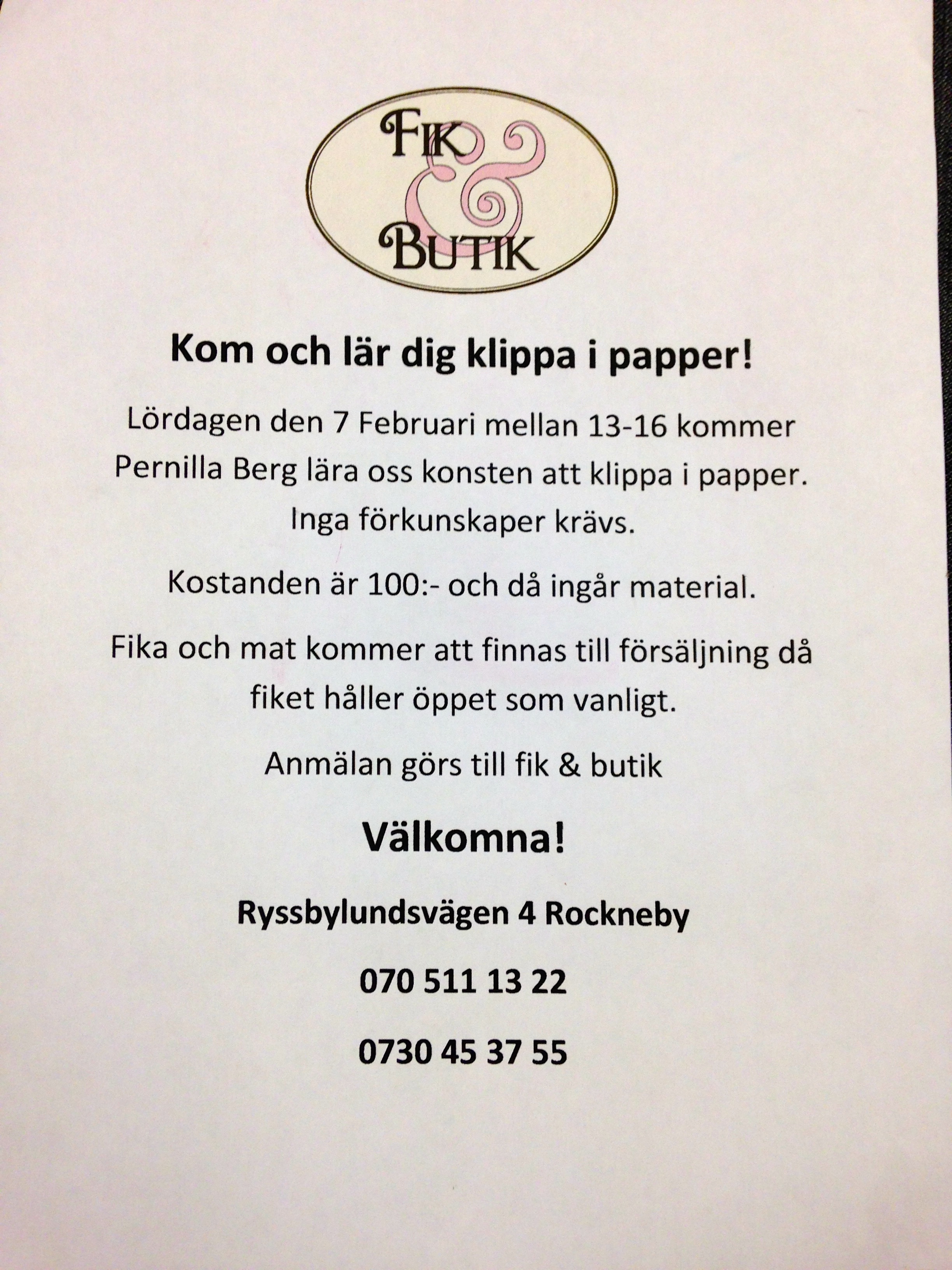 Fik & butik i Rockneby Välkommen på Vernissage 18/1 13.00-16.00 Kom och ta en fika ja kommer att vara där! Jag visar mina klipp och lampor i Rockneby 18/1-7/2 2014